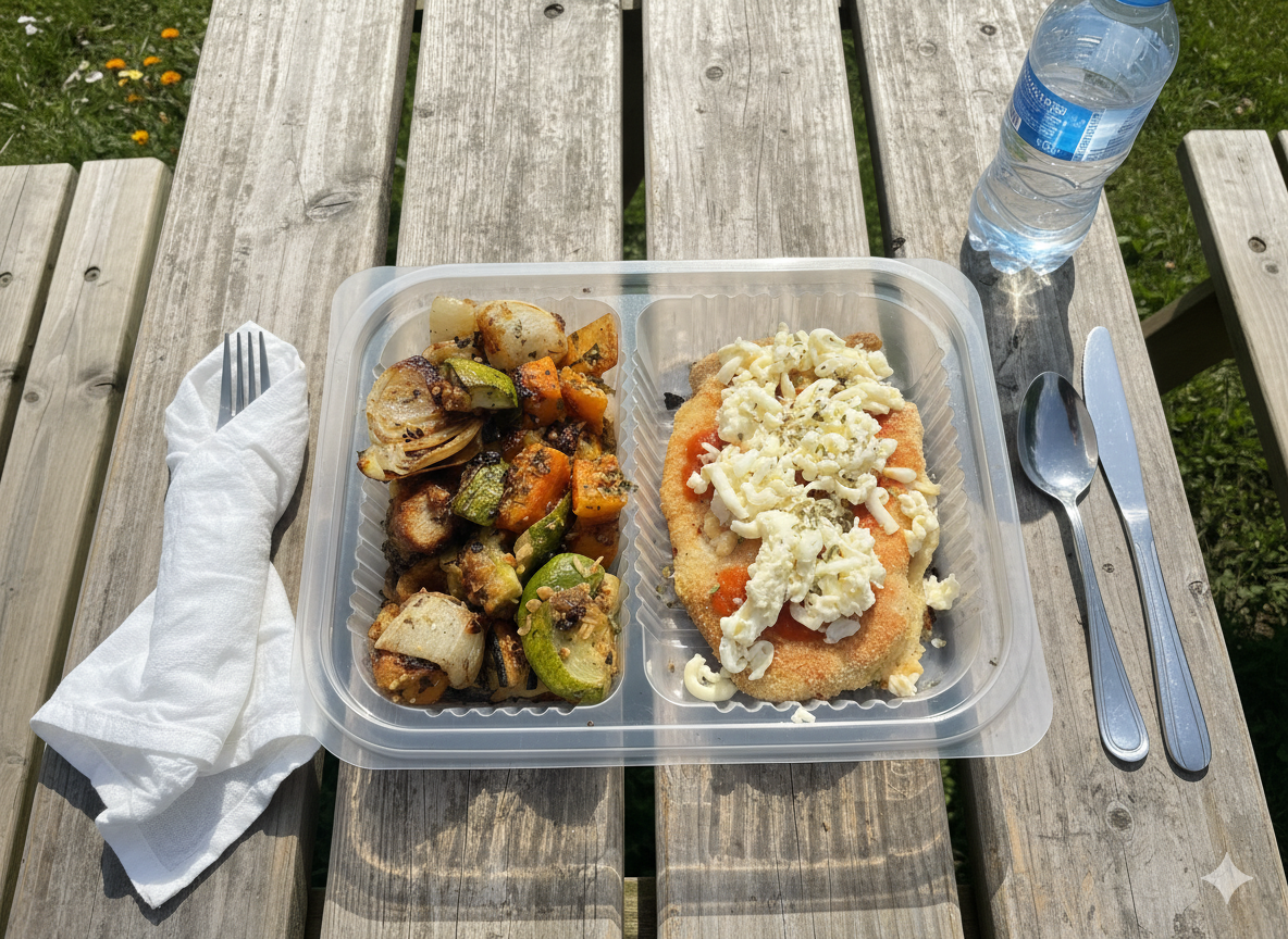 Milanesa de Pechuga de pollo napolitana, con mix de veggies al horno