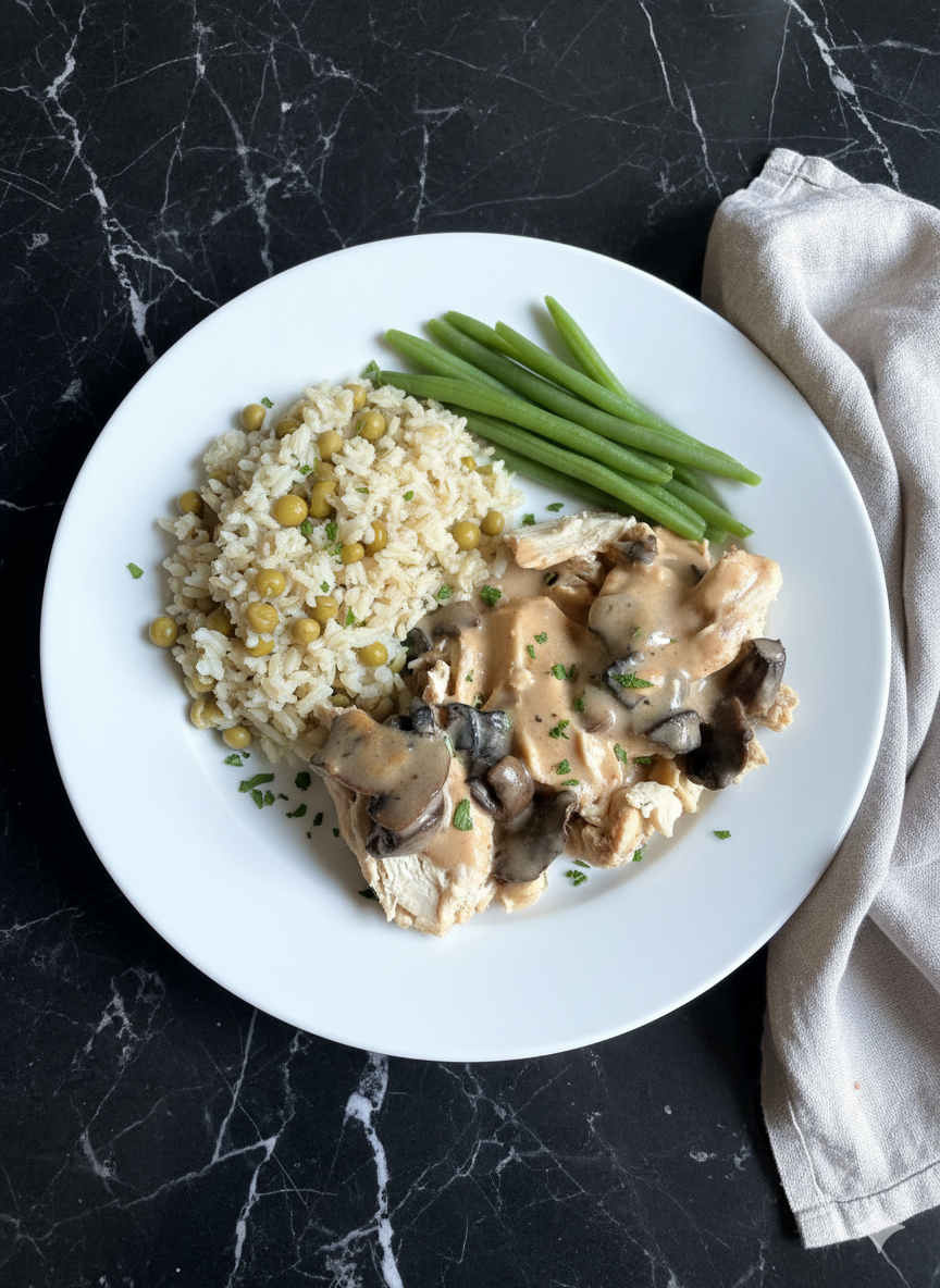 Pechuga de pollo con una liviana salsa de Hongos, acompañado por Arroz integral especiado y chauchas