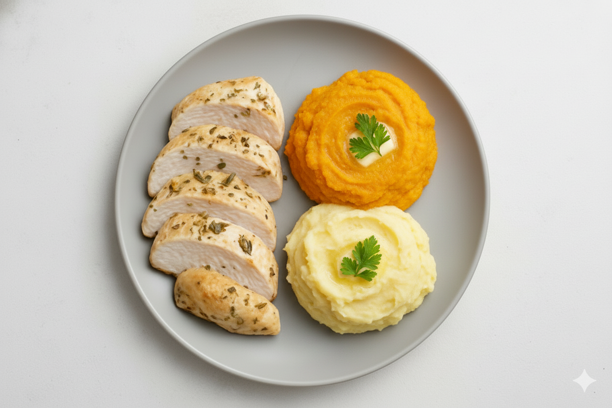 Pechuga de pollo grillada con limon y hierbas, acompañado por Pure mixto