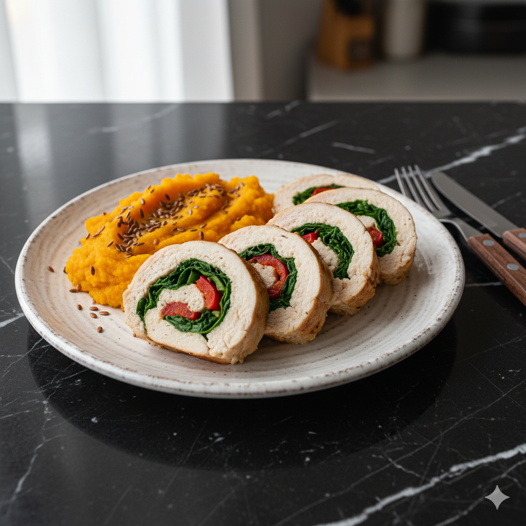 Arrollado de Pechuga de pollo relleno de vegetales con pure de calabaza