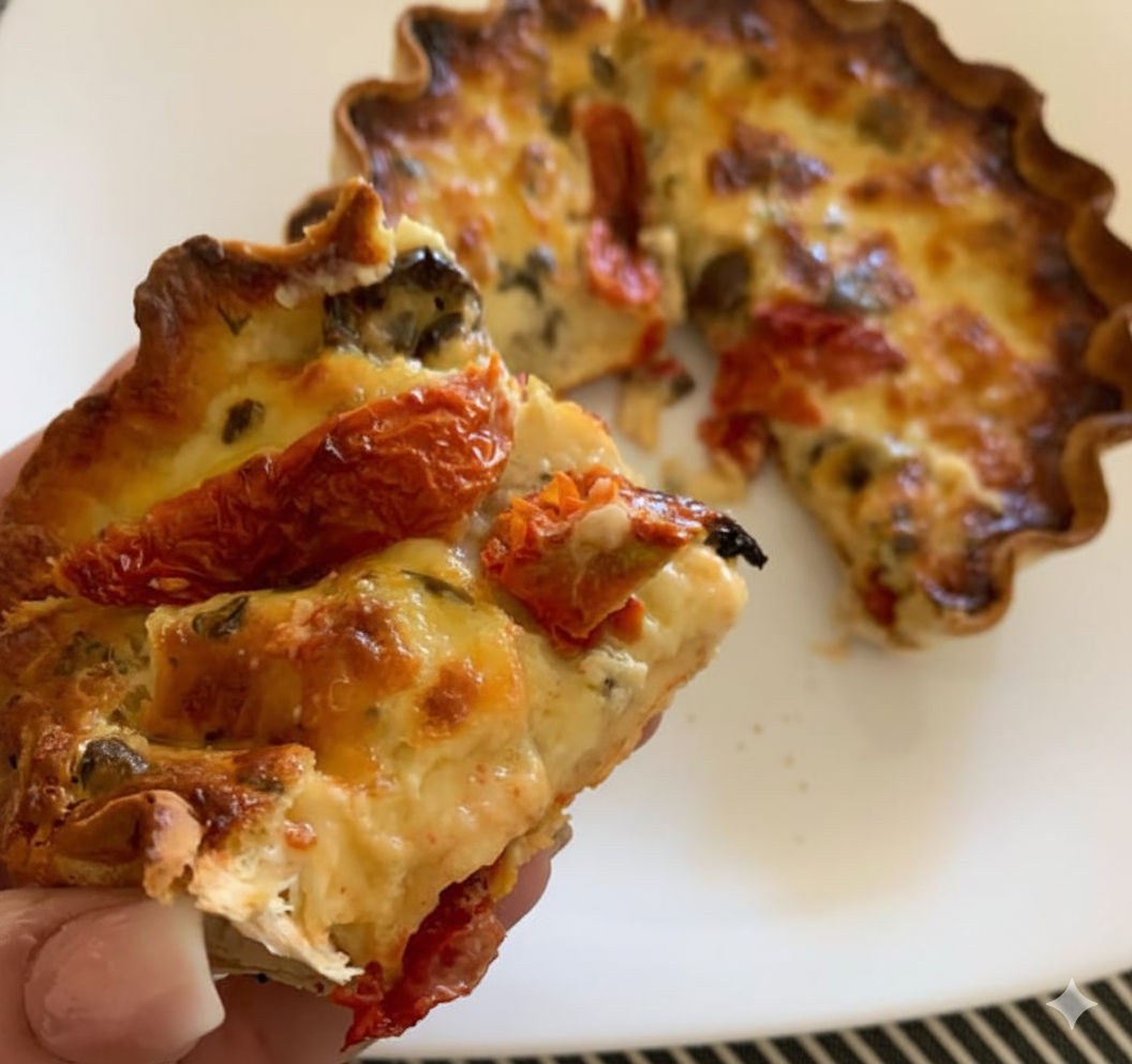 Masa semi-integral, queso portsalut, olivas negras, albahaca y tomates secos