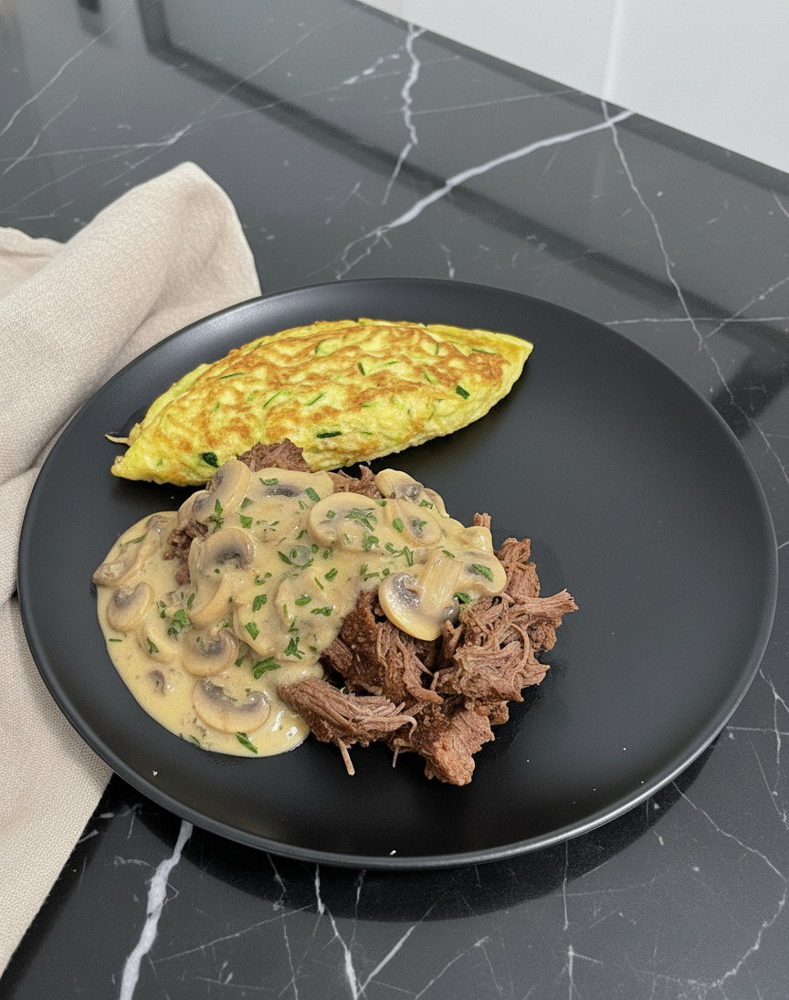 Ternera con una salsita liviana de hongos, tortilla de zapallitos para acompañar