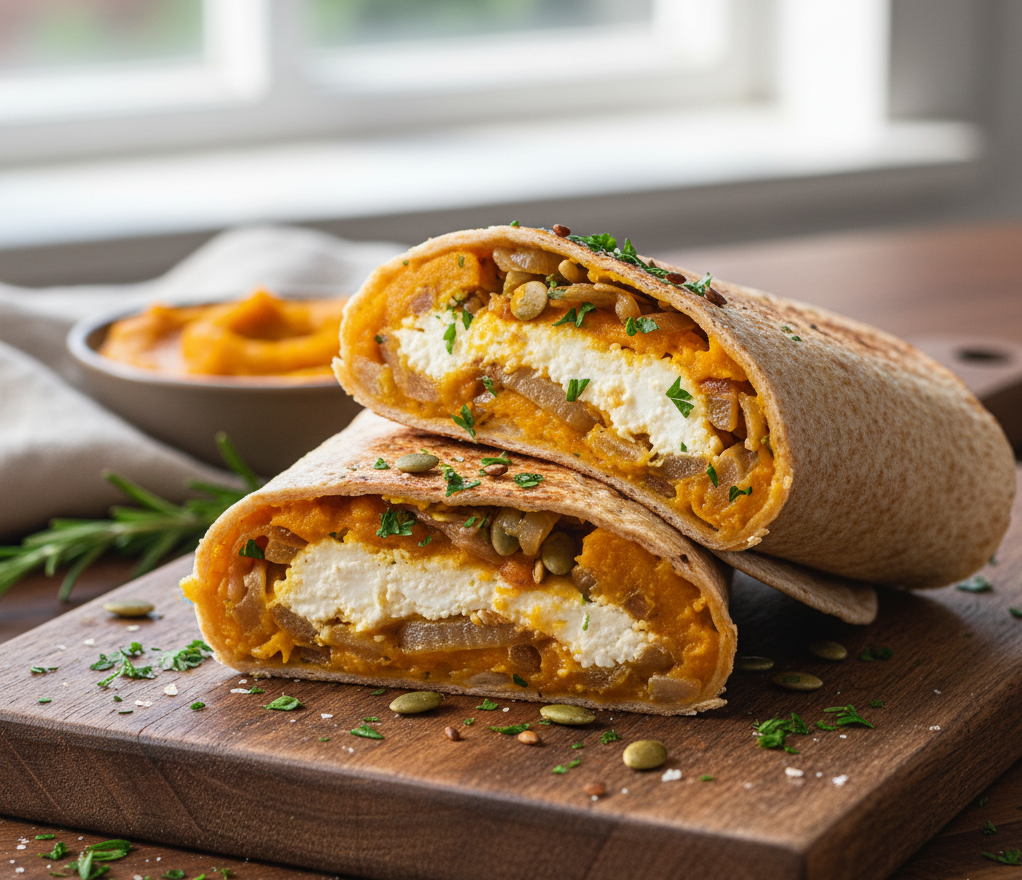 Pure cremoso de calabaza, hongos, cebolla caramelizada y ricota magra. Wrap integral.